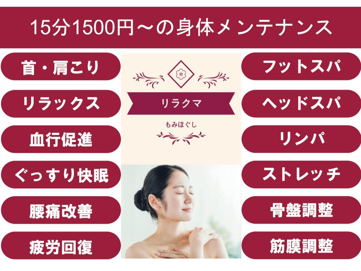 男性も女性もご来店OK◎【お手頃な価格設定&施術時間最短15分~!ご予定の前やお仕事帰りなどのスキマ時間にもお立ち寄り頂けます!】お客様ひとりひとりの身体の状態やお悩みに合わせた施術をご提案し、改善とリラックスを目指します♪疲労/むくみ/首肩こり/睡眠/冷え/目のお疲れや血行促進などの不調の緩和に効果的!!